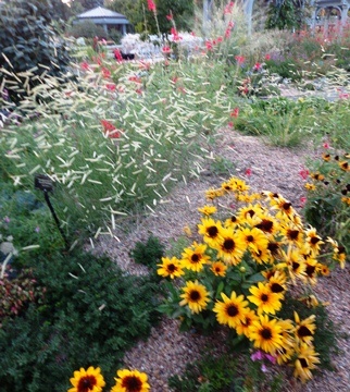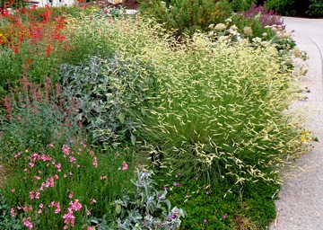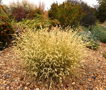 'Blonde Ambition' thrives in a wide array of soils and with different watering conditions--about the only place I would not put it is in a bog or deep shade. It looks almost as good now in early winter as it did in high summer when I took some of these pictures. One thing I can tell you: it makes a wonderful companion plant to all manner of xeric perennials throughout the growing season. The folks at Plant Select have been astonished at how quickly news of this great new grass has spread: it has become one of the top sellers in that very successful program: do take a look around your garden this winter and decide where you can put more of this in your yard. Can we ever have enough in the way of blondes? Or ambition for that matter?