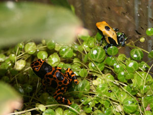 We’ve had the poison dart frogs here in the Boettcher Memorial Tropical Conservatory since early November when they were still pretty young. Conservatory staff members have been raising fruit flies, dusting them with vitamins, and feeding them to the frogs every day since then, and we are amazed at how much the frogs have grown.