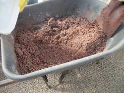 Once you have mixed up your dry ingredients in the wheelbarrow/mixing container, it is time to add water. It is important to only add a little bit of water at a time; if your mixture becomes too wet, the end result will not resemble hypertufa. If you have a partner to aid in this process, the extra set of hands will be very helpful. While one person is using a shovel to turn the mixture, the other person can be incrementally adding water and synthetic fibers. This is also a good time to make any adjustments to the color of the mixture by adding more dye, if necessary. The desired result is a mixture that when squeezed in your hand both holds its shape and releases just a few drops of water. If you squeeze the mixture and it feels squishy or you can visibly see a lot of water forcing out, you have added too much water.