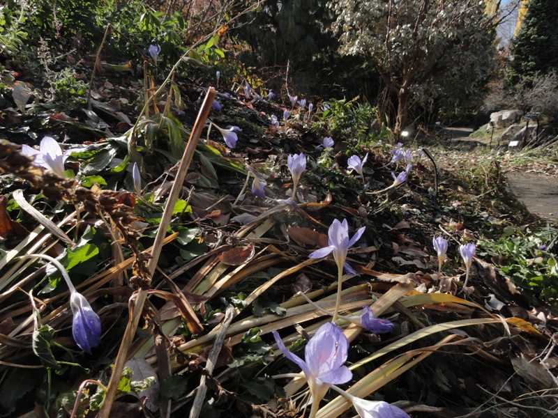 And finally, there are still some ""Autumn Crocus"" in bloom (the multiple quotes are meant to alert you to the fallacious nature of the name. People still insist on calling Colchicums crocuses, although they are more closely allied to lilies (albeit botanists have recently put them in their own family: Colchicaceae!). Lilies have six stamens, but Iridaceae like Crocus only have three. End of botany lesson! But it is not the end of our flowering season by any means. I suspect that the grove of Witch Hazels at Regis Arboretum are coming into bloom any day now (Hamamaelis vernalis) and my Daphne x transatlantica has hundreds of fresh flowers. There are several species of cyclamen still blooming, and pansies around town are just kicking in. Let's not forget unseasonable blooms on lots of ice plants, phlox and geraniums! And of course, the Ussurian pears, the rowans and most oaks around town are ablaze with spectacular autumn color. The calendar and I proclaim that winter is still not here. Ellen--let's not rush things!