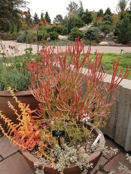 All summer long the containers throughout the gardens did their duty. I particularly admire the wonderful succulent containers in the South African plaza: but a single flower of Pelargonium just off center, but such richness of color and texture in stems and chubby leaves. No doubt these are tucked away safely in a glasshouse, waiting to come out again next spring. But it takes the intense summer sun and brash winds to bring out these colors in the out of doors. I love how in this picture we have the intricate vignette of container in the foreground, but a vista of intriguing mystery beyond. This interplay of vista and vignette is really the secret to the magic of Denver Botanic Gardens! In my opinion, nobody does it better than our talented horticulturists! We can all get all excited about winter bark, branches and berries, but it's fun to take a longing, lingering look back at a really awesome growing season! And now let's dream about the one to come!
