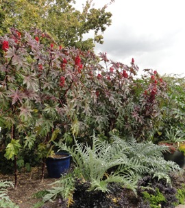 In the sere winter months (which have their own austere beauty, I admit), we forget how lush things were just yesterday: the giant Cardoons spreading almost six feet across, and towering Castor beans (great crowd pleasers) along the Drop Dead Red border. Francois Villon asked "Where are the snows of yesteryear?" Well, others pine for verdure and the lolling luxury of summer.